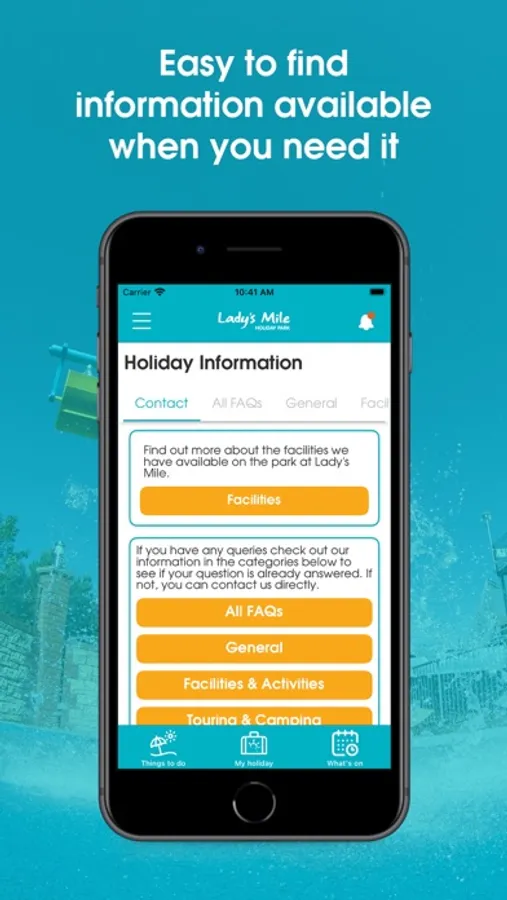 To help with your visit at Lady’s Mile, this app also includes a full FAQs section to answer any questions you may have before and during your stay.