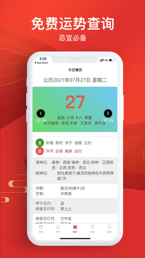 黄历宜忌、节日节气、吉日查询、天气预报于一身的黄历万年历app。