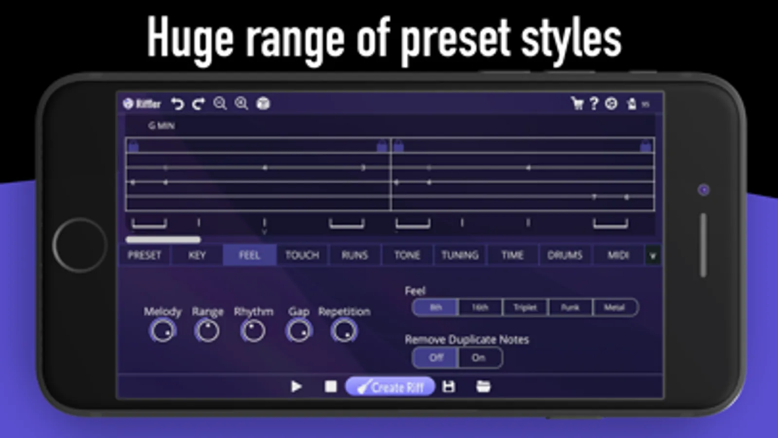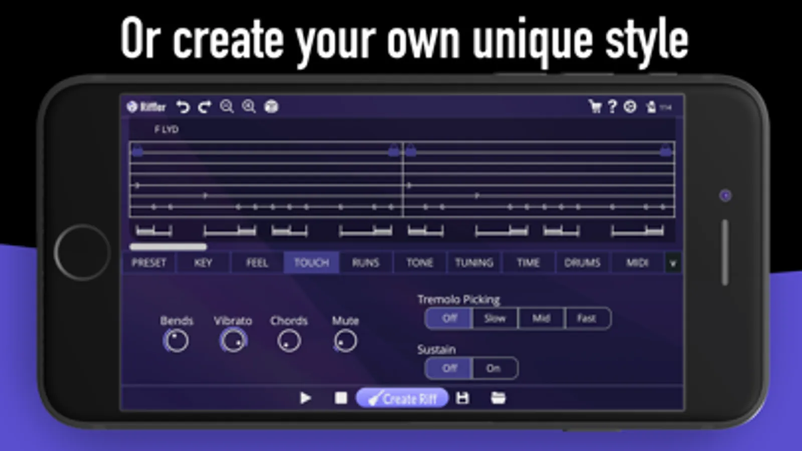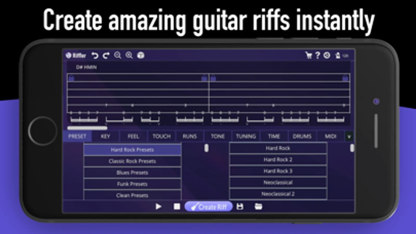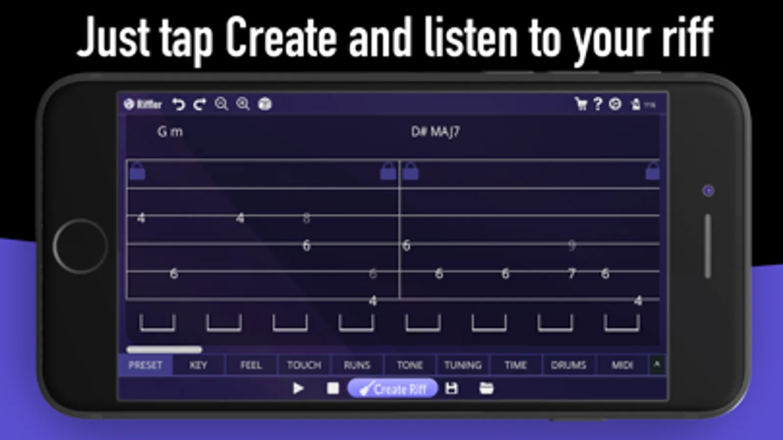 The easiest way to get started is to select from the huge list of preset musical styles, tap "Create", and a unique guitar riff will be made. The created riff is displayed as guitar tablature which you can listen to and save.