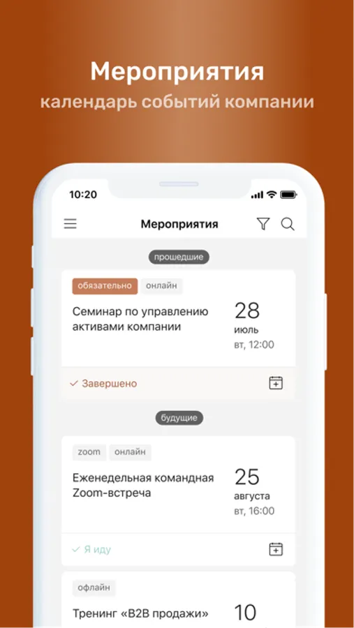 ⁃ Календарь корпоративных мероприятий с возможностью подать заявку на участие