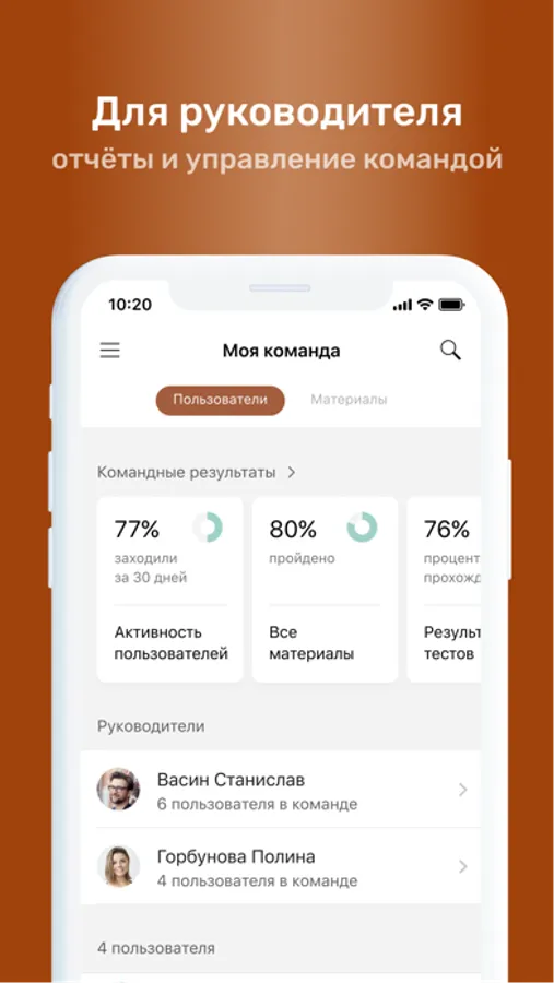 ⁃ Вы руководитель? Публикуйте и обсуждайте новости команды прямо из приложения, выдавайте награды и проверяйте прогресс обучения