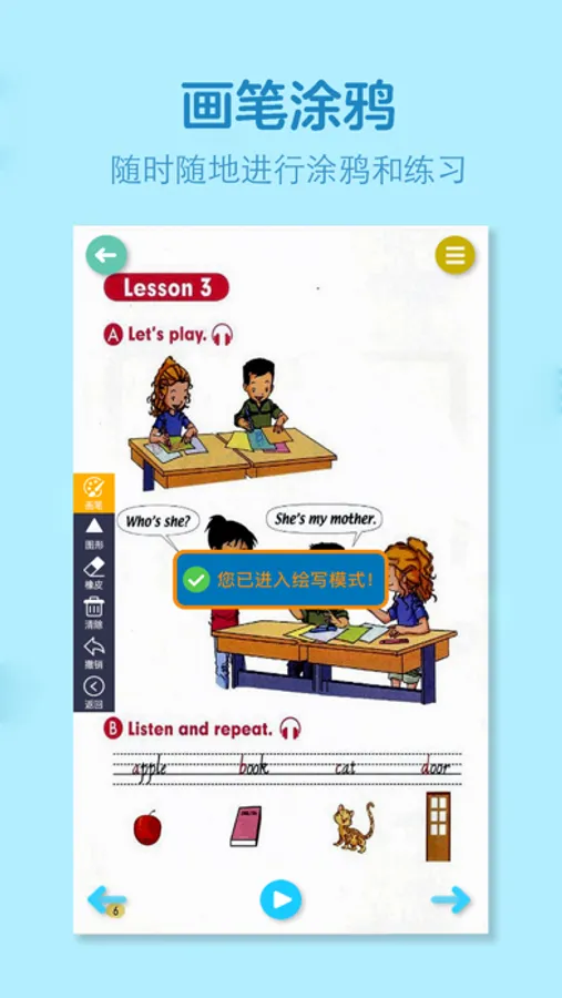 【2】画笔功能,全屏涂鸦让学习更加的有趣让学习更加高效率。完全同步最新发行教材,绝无缺漏页现象。