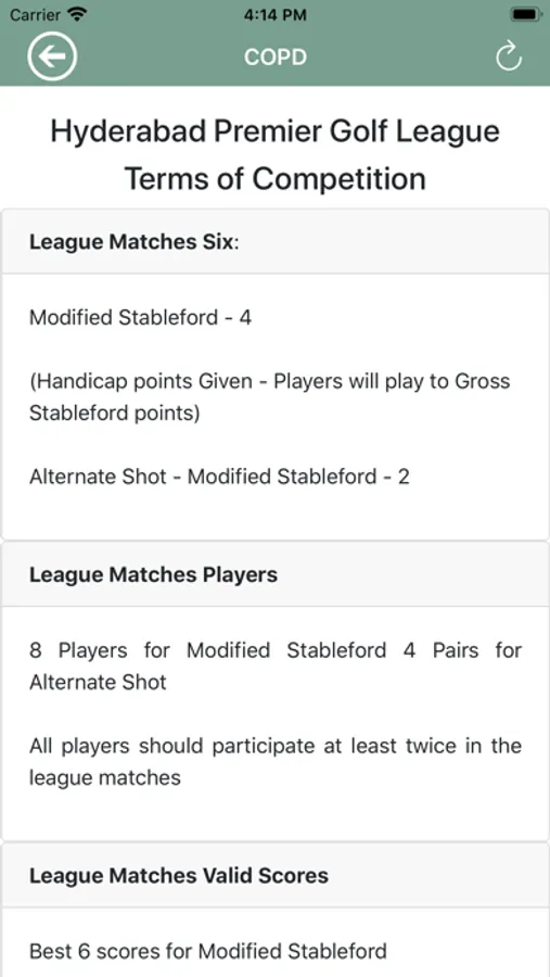 The results section shows all the results of all past matches. It shows outcome of a match as well as the team wise performance along with a detailed view of hole wise scores.