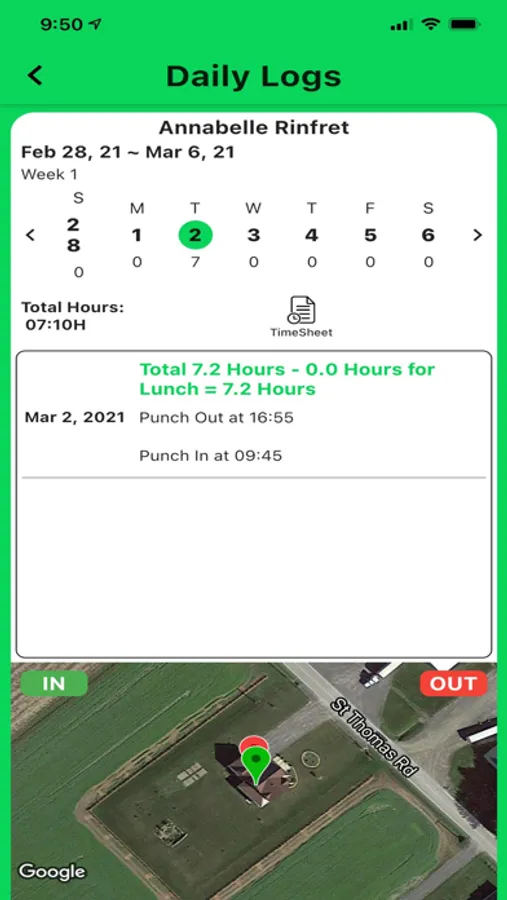 -Employee sections include Punch Logs, Hour Revision Request section, and Timesheet view