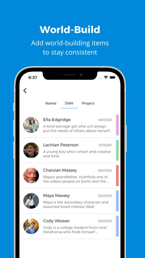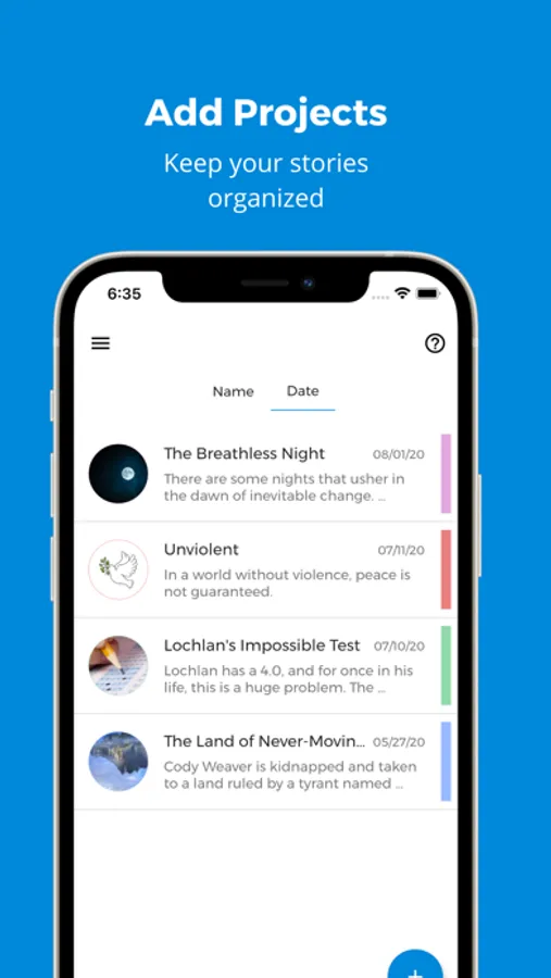Projects are at the center of the Writer's Companion App. Every goal you set, outline you create, and world-building item you add will be related to a Project to help you stay organized. The word "Project" can be replaced with "Novel", "Screenplay", or "Dungeons and Dragons Campaign"; it just depends on what you use the app for!