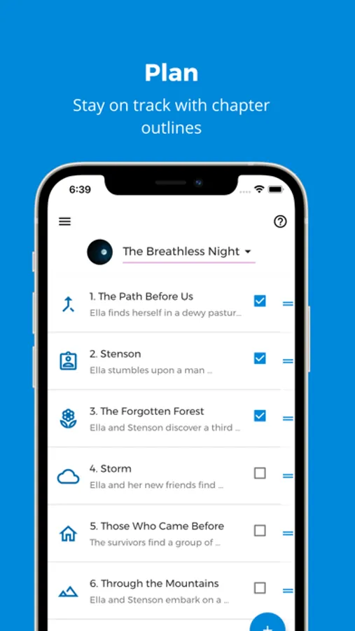 The planning tool allows you to create chapter outlines for your Project. Each Project can have one chapter outline. You can add world-building items to each chapter so you can keep track of which characters are present in the scene, where it takes place, or really anything you might need to track! You can easily view your writing progress by checking the box next to a chapter when it is complete.