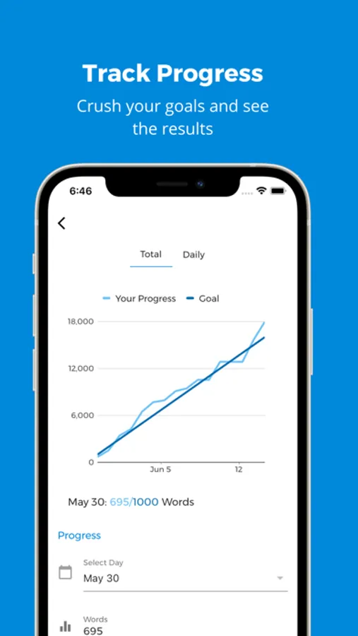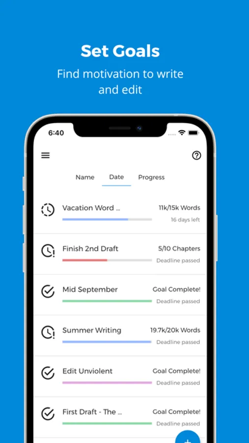 Goals help writers stay on target to achieve their dreams. Use this part of the app to create and edit goals and to view your progress. Goals are tied to your Projects so you can keep your progress organized. Goals don't have to be measured in word counts. You can use chapters, hours, pages, scenes edited—anything you can think of!
