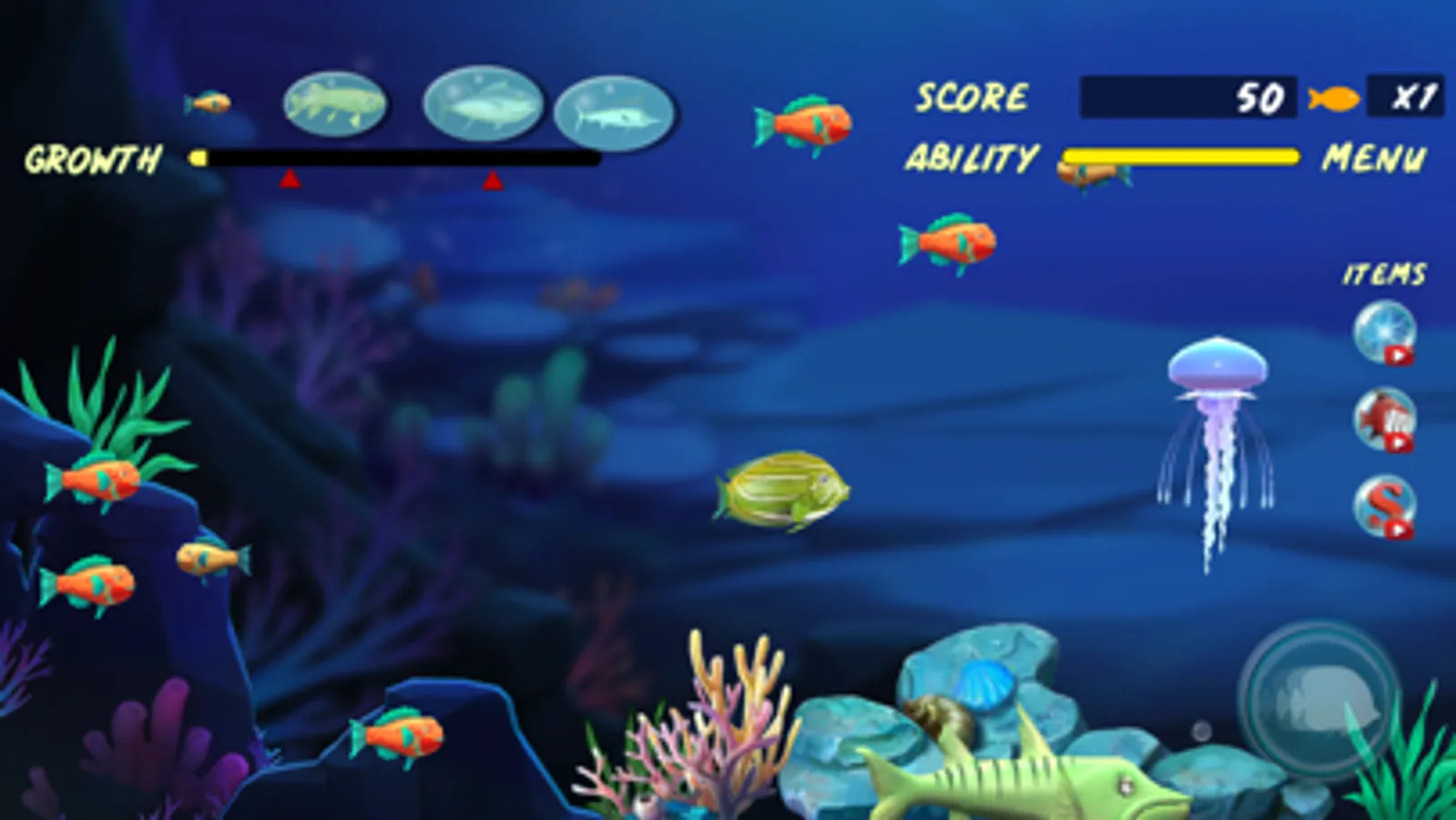 • The player takes on the role of different aquatic species each trying to move up the food chain. As smaller fish are eaten, the player's own fish grows in size and becomes capable of eating somewhat larger fish.