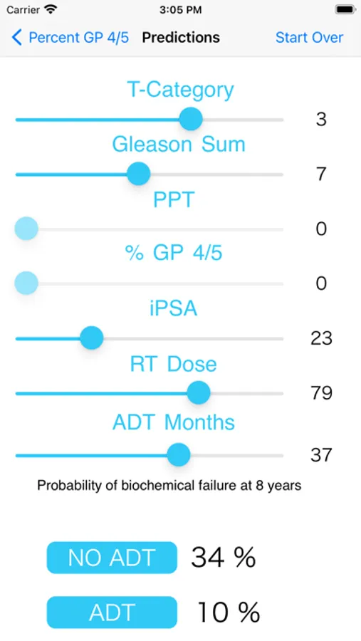 P-Predict estimates the probability of biochemical failure (BF) at 8 years after RT, taking into account palpation T-category, biopsy Gleason score, the percentage of tumor cells with a Gleason pattern of 4 or 5, the percentage of tumor tissue, initial pretreatment prostate-specific antigen (PSA) level, ADT duration, and RT dose.