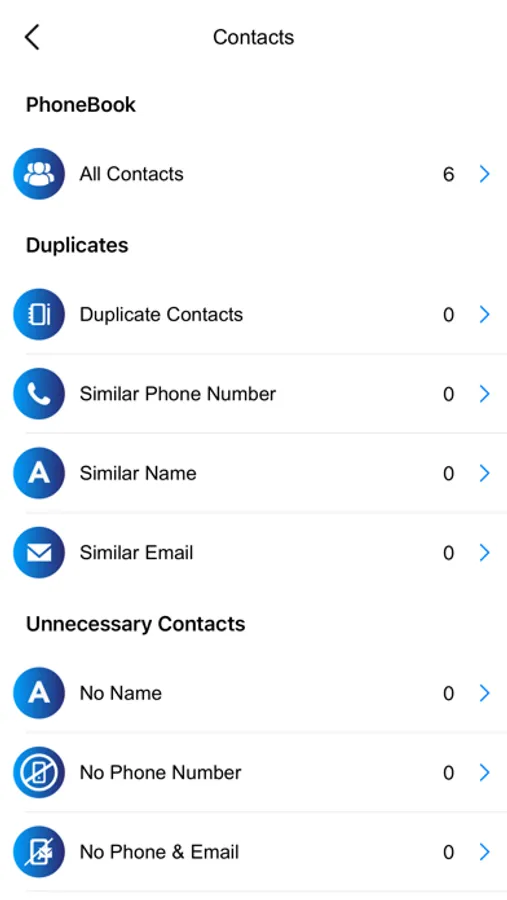 Cleaner will help you to find and merge these duplications, by allocating contacts with similar names or identical phone numbers and email addresses.