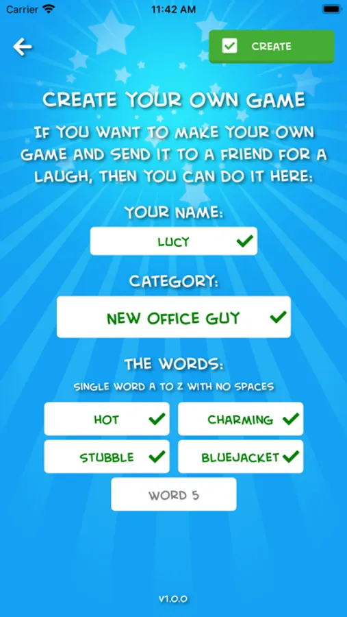 The ‘Share a game’ option allows you to create your own games and send them to a friend allowing infinite possibilities for categories. You can come up with your own games for flirting with your partner, or your crush, making funny jokes for friends, or testing your family's knowledge with categories only they will know! Shared games can be played by anyone with a computer or internet enabled mobile phone using the web version so anyone can join in the fun!