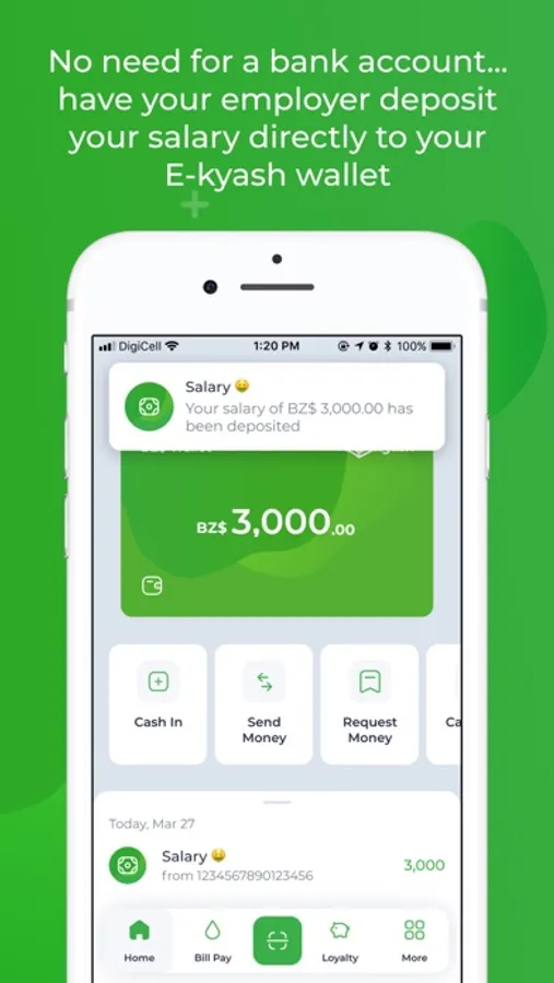 E-kyash allows your employer to deposit directly to your wallet without the need to have a bank account. Using their existing salary payment method, they input your phone number directly into the account number field and process their salary. You will be instantly notified of your Salary Deposit.
