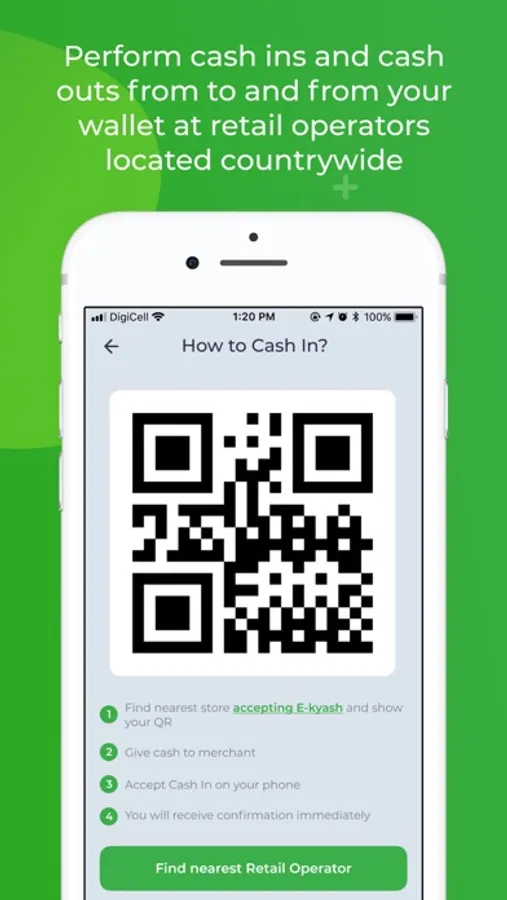 E-kyash allows you to transact online via website or social media channels using the My QR feature embedded in the app. Perform cash ins and cash outs to and from your wallet to retail operators located countrywide.