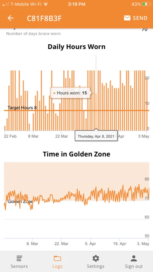 The downloaded report shows the daily wear patterns and the average hours worn per day over the selected time period. These reports can be easily sent via email to any member of your care team to review such as your Physician, Orthotist, Physical Therapist, or Nurse.