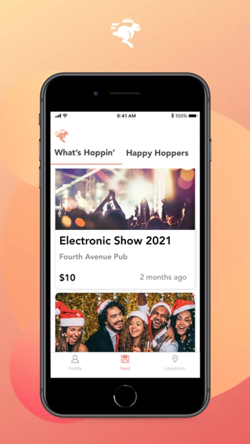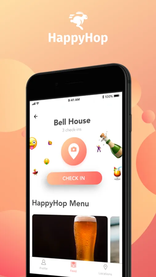 connect with friends that are looking for a fun day or night out on the town. It’s Bar Hopping with a twist. The HAPPY HOP App will show you all the different bars, restaurants, and lounges around you as well as food and drink specials that they are offering that you can only receive if you are a HAPPY HOPPER.