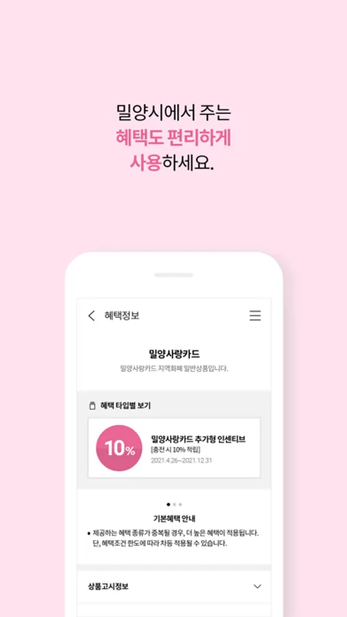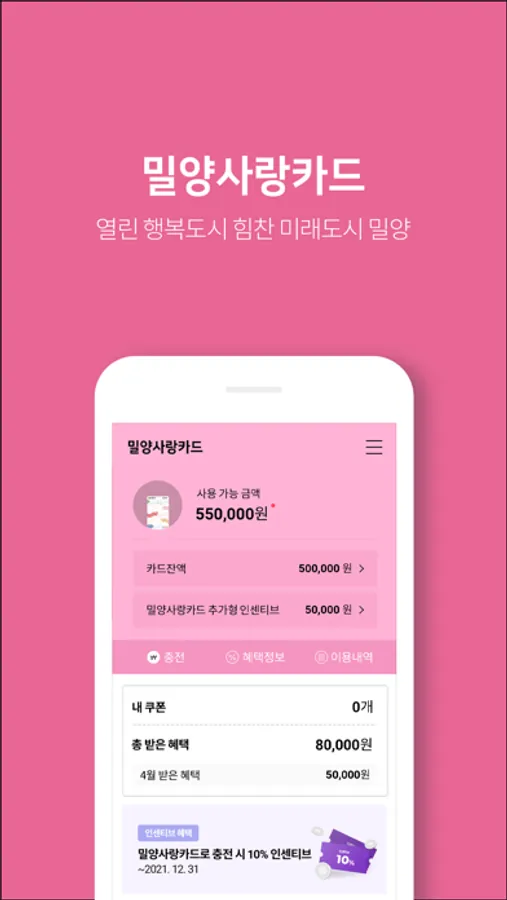 충전식 선불카드. 형태의 지역화폐로, 밀양시 지역화폐 등록 가맹점 내에서 사용할 수 있습니다.