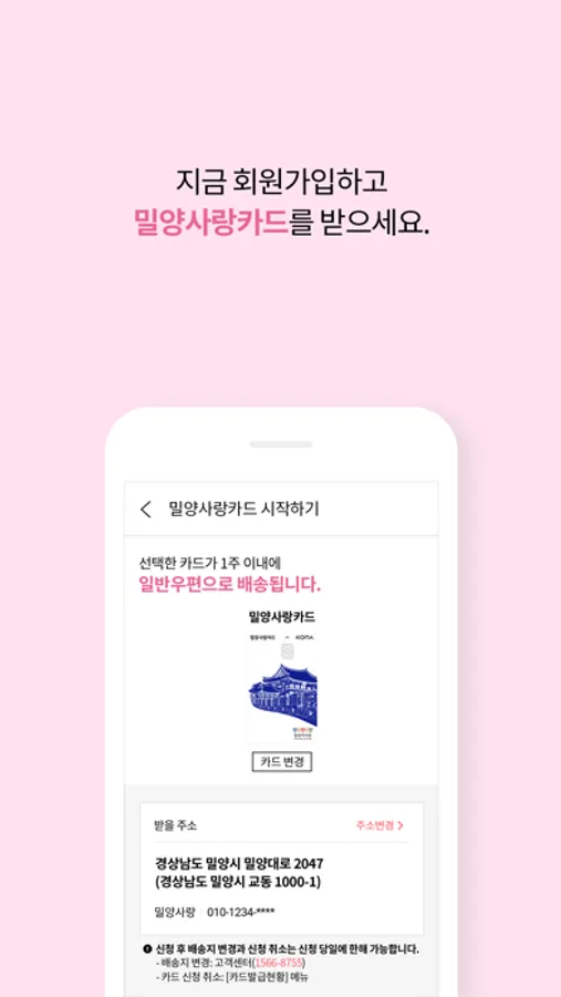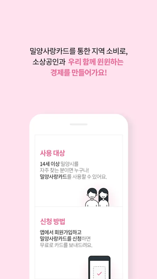 - 복잡한 계좌 개설이나 은행 방문 없이, 밀양사랑카드 앱에서 바로 카드를 신청할 수 있습니다