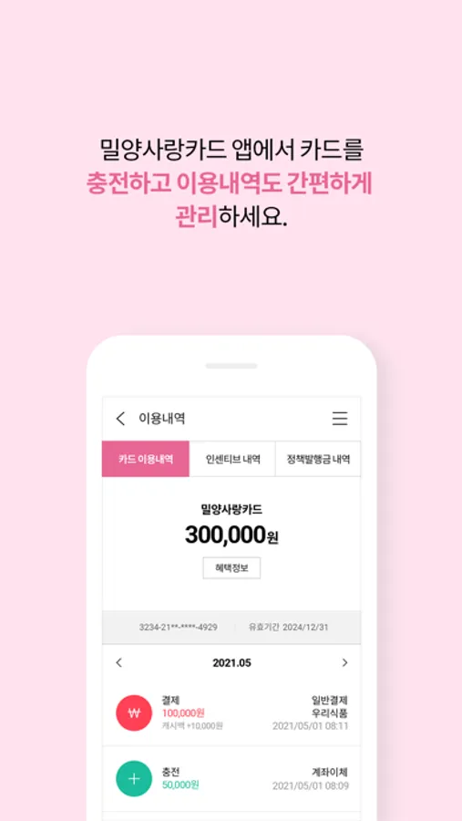 - 카드 이용 내역은 밀양사랑카드 앱에서 간편하게 확인할 수 있습니다.