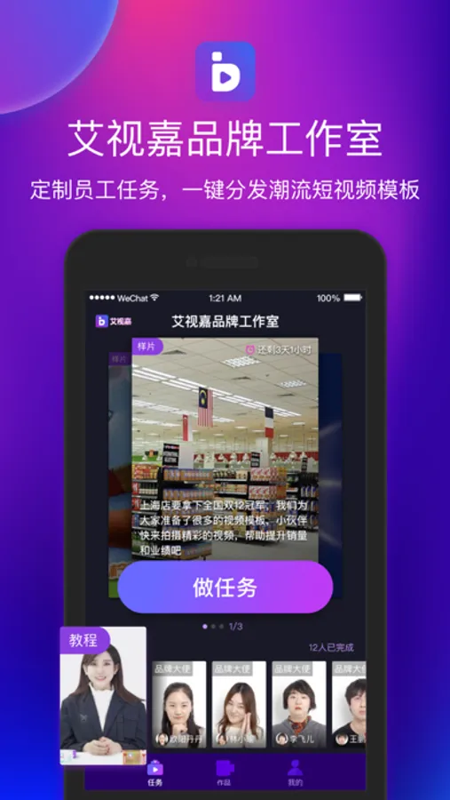 选择任务,参与DIY拍摄,在每一个分镜中学习如何摆POSE,做表情,情绪表现等短视频拍摄技巧!特邀明星网红,为员工量身定制拍摄指导!