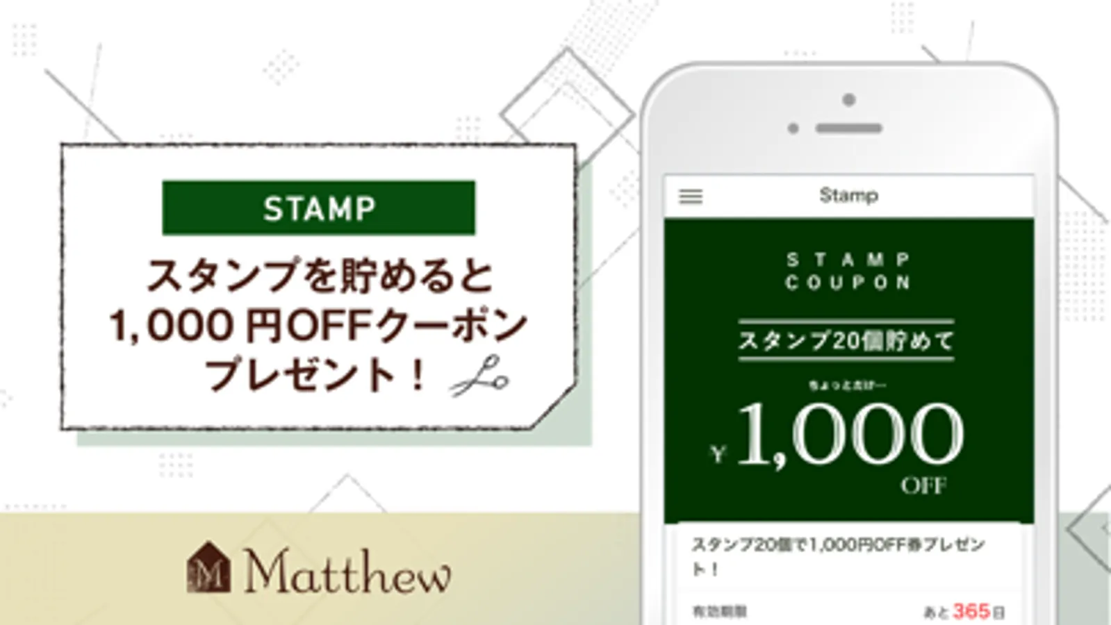 スタンプ20個貯めて、1,000円OFF券プレゼント!