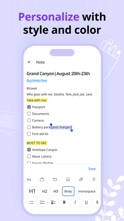 ● in a note section with tree-structured folders, you can easily navigate through your checklist of notes and keep important information on hand