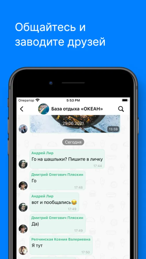 В общем чате базы отдыха “Океан” каждый может поделиться своими впечатлениями, порекомендовать развлечения и кафе, обсудить все самое интересное в “Океане”, а также задать интересующие вопросы, если хочется узнать мнение тех, кто уже был в аквапарке или пробовал мороженое в кафе-мороженом, ездил в увлекательные туры и просто знает местность чуточку лучше.