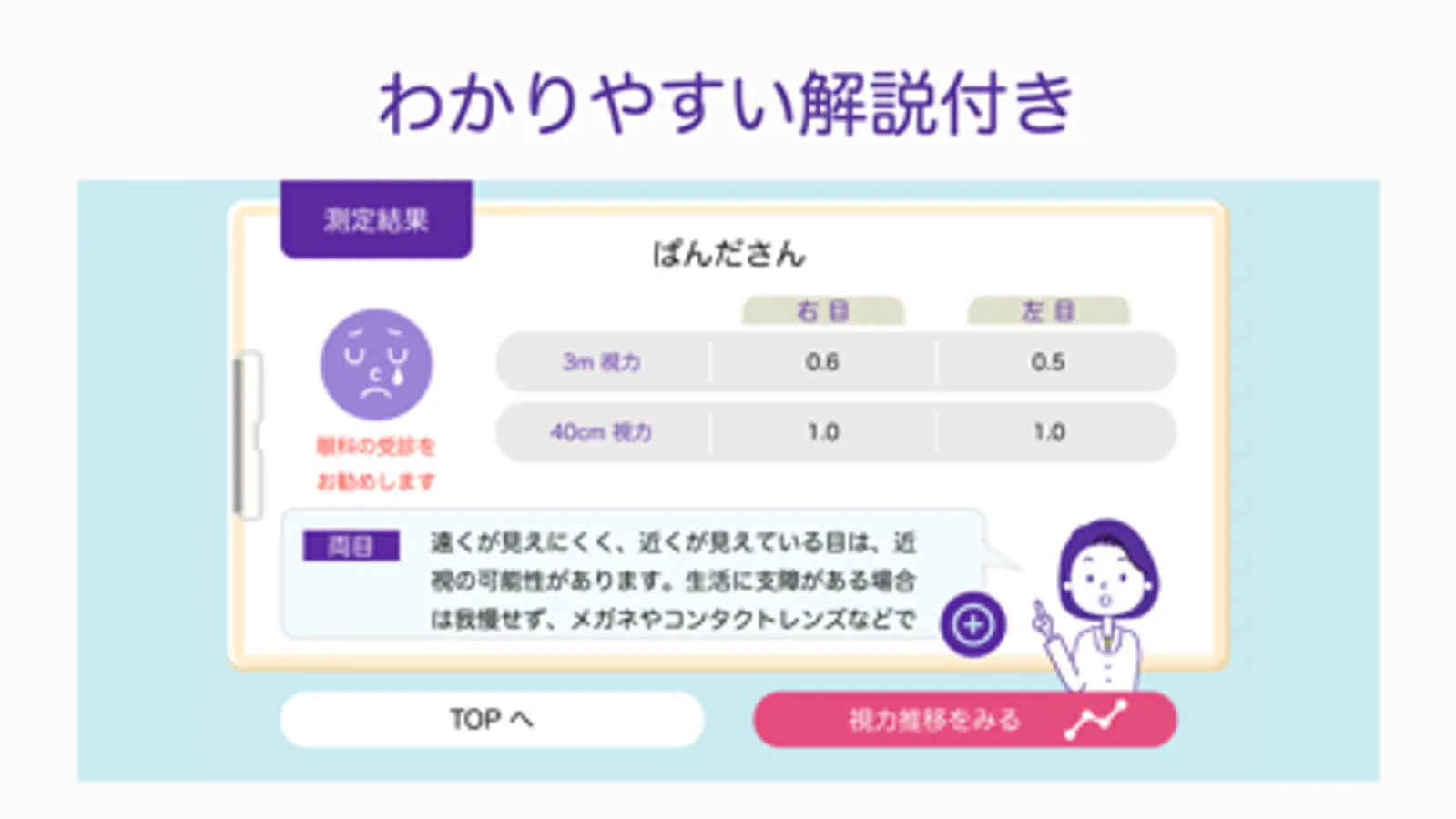 視力の変化や左右の違いをわかりやすくチェックできます。