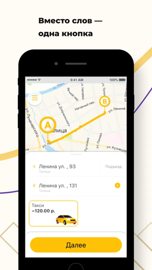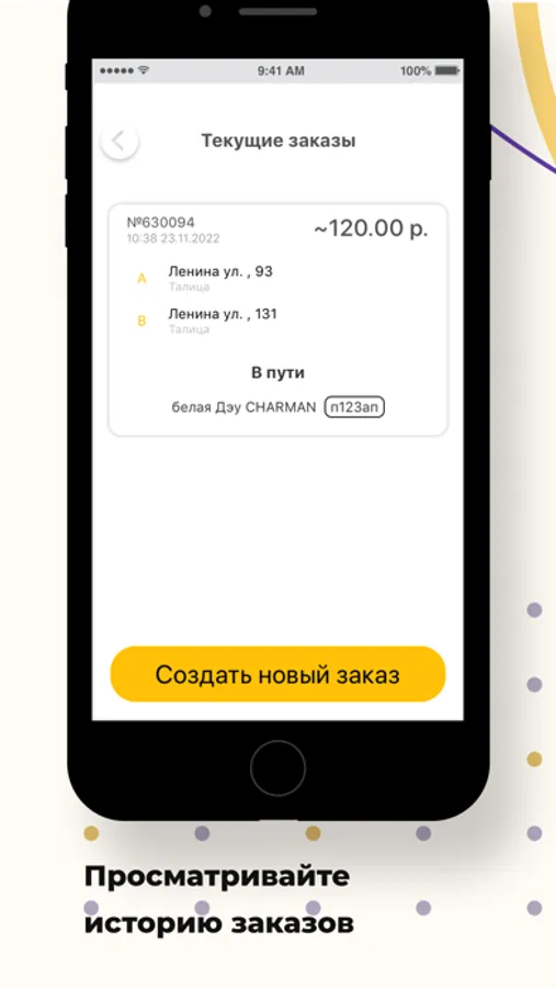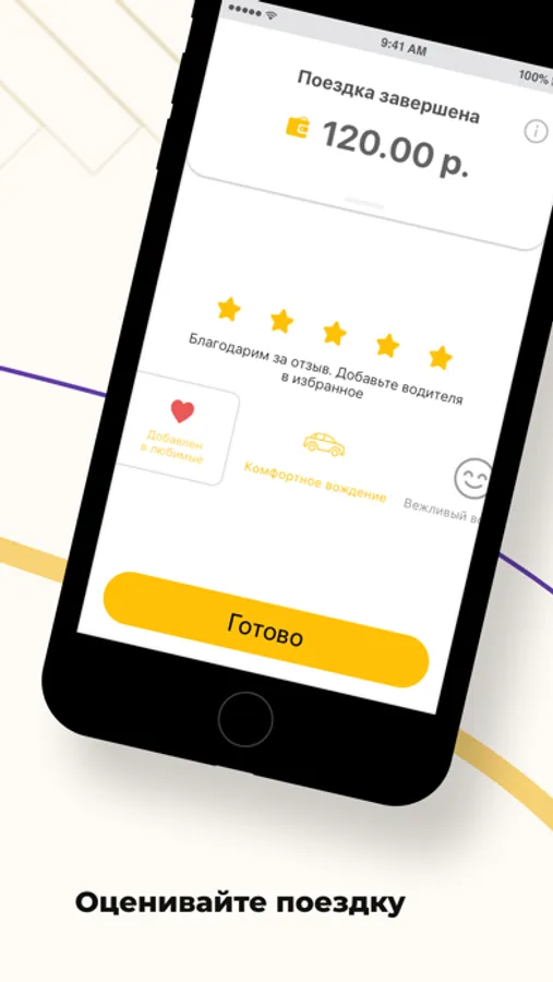 Следите за поездкой на карте. Приложение сообщит время подачи, марку, цвет, номер машины, а также имя водителя.