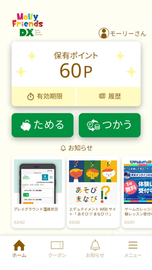 ・ためたポイントは、お店で遊べるお得なクーポンと交換ができます。