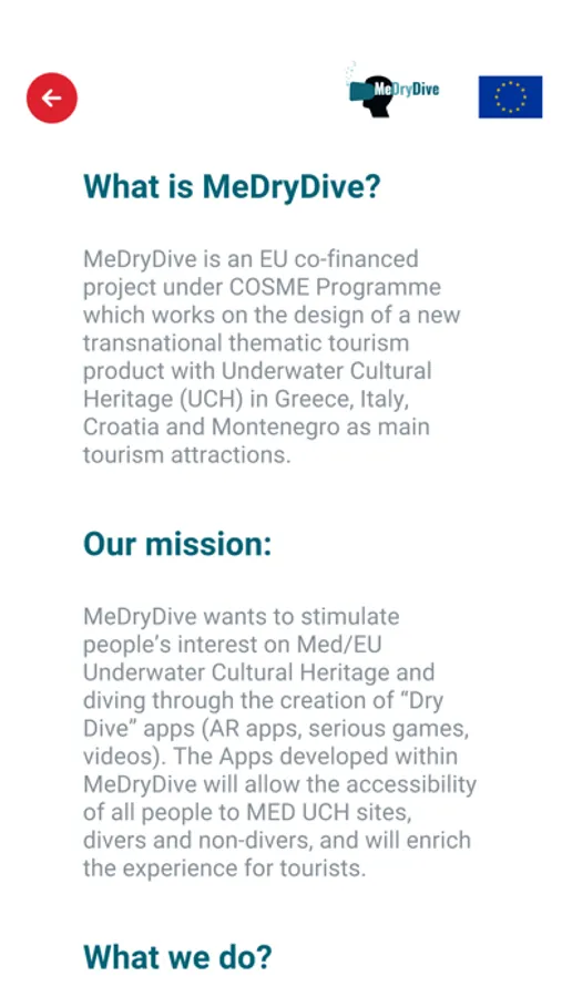 With this application, by using an interactive AR leaflet with underwater videos, you can dive into the past and embark on an exciting exploration of authentic wrecks and locations of Underwater Cultural Heritage in four Mediterranean countries: Greece, Italy, Croatia and Montenegro.