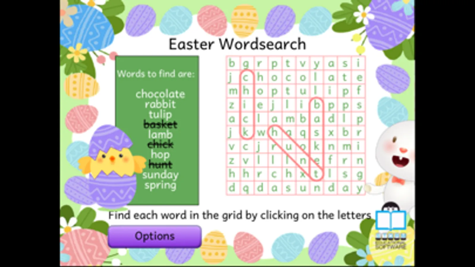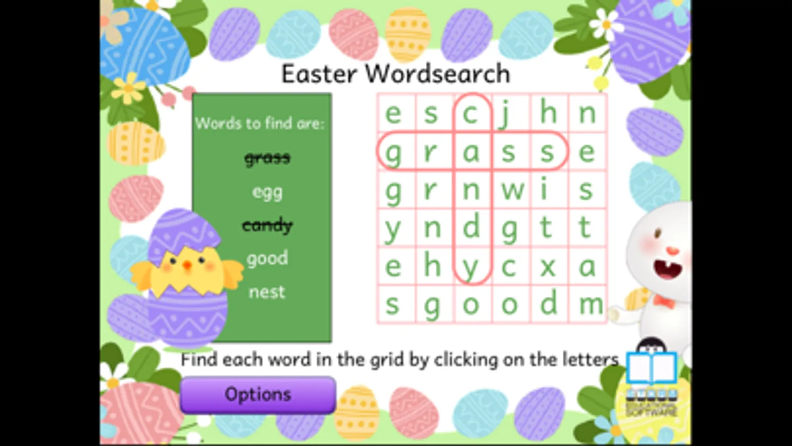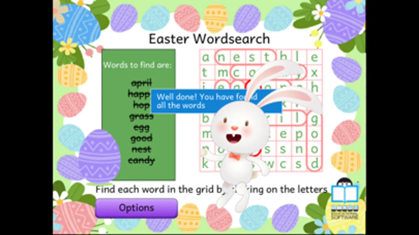 When each word is found, a chick will spring out of the egg on the screen, and when all the words have been found, the rabbit will perform a somersault across the screen!