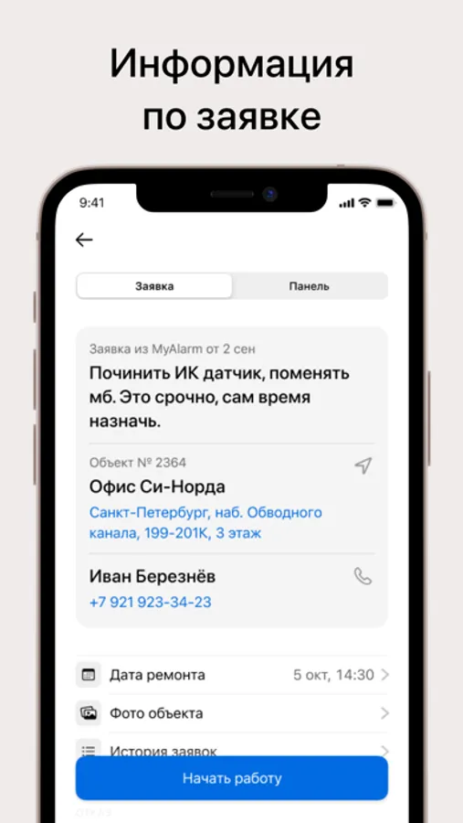 • Не нужно звонить диспетчеру — в заявке все данные об объекте: адрес, контакты, оборудование, данные по шлейфам;