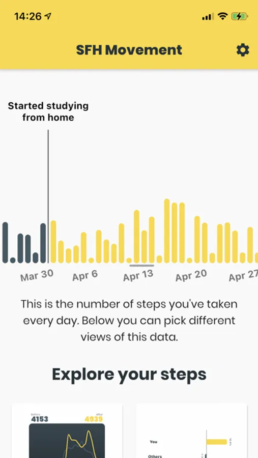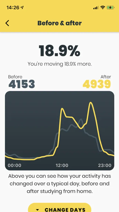 By picking a date where you started studying from home, you will be able to explore whether your movement patterns have changed since you started studying from home. The app visualizes your movement in the form of steps data from your phone, through Apple Health, Google fitness or Garmin.