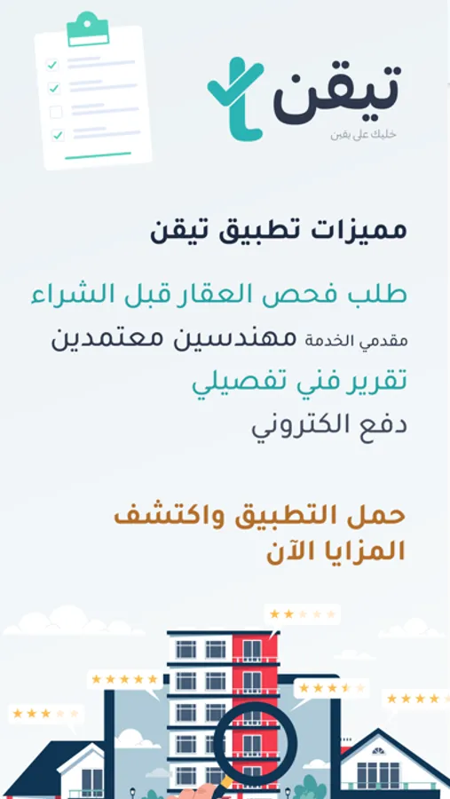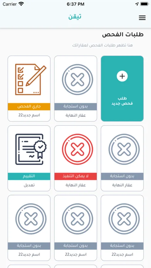 يمكنك من خلال التطبيق طلب فحص عقارك (فيلا، شقه، عماره سكنية، سكن عماله ... وغيرها) وارسال الطلب للعديد من الفاحصين المعتمدين، سيقدم الفاحصين عروض السعر لفحص عقارك ويمكن اختيار السعر المناسب لك.
