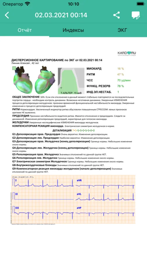 КардиРу - это медицинский прибор для регистрации ЭКГ в домашних условиях или в стационаре клиники. Прибор регистрирует электрокардиограмму (ЭКГ 6 стандартных отведений I,II,III,aVR,aVL,aVF или 12 стандартных отведений I,II,III,aVR,aVL,aVF, V1,V2,V3,V4,V5,V6) покоя в течение 30 секунд. Исследование передается от прибора КардиРу по Интернет-каналу сотового оператора или по любому Wi-Fi подключению на сервера КардиРу. Сим карта сотового оператора поставляется в комплекте с прибором для передачи исследований. После исследования формируется ЭКГ, описание ЭКГ и автоматическое заключение, которое позволяет выявить острые состояния, отклонения на ранней стадии или следить за динамикой состояния сердечно-сосудистой системы при наличии патологии. Исследование с автоматической оценкой ЭКГ становится доступным в мобильном приложении.