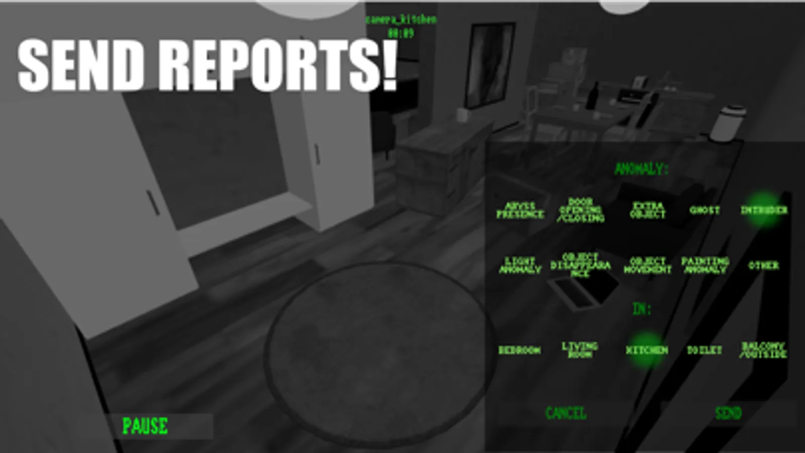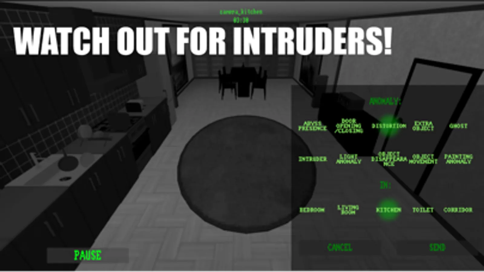 A horror game about monitoring live surveillance camera footage and spotting anomalies that range from furniture movement to otherworldly intruders. After spotting an anomaly you have to file a report describing the type and location of the anomaly. Some anomalies are easy to spot while others can be very difficult to detect. You will need sharp eyes and good memory to survive the entire night. Maybe you'll even discover some secrets along the way!