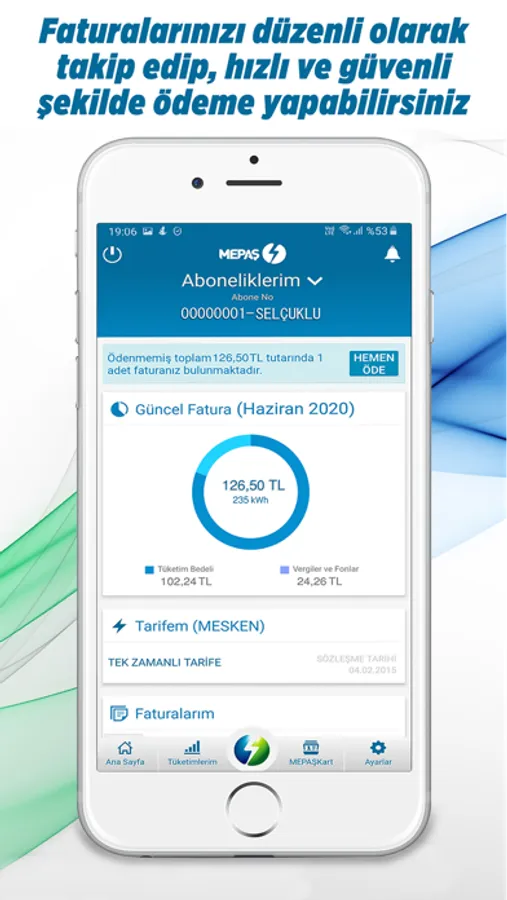 Faturalarınızı görüntüleyebilir, borç durumunuzu sorgulayabilir ve güvenle ödeme işlemlerinizi gerçekleştirebilirsiniz. Ayrıca ödemelerinizi izleyebilirsiniz.
