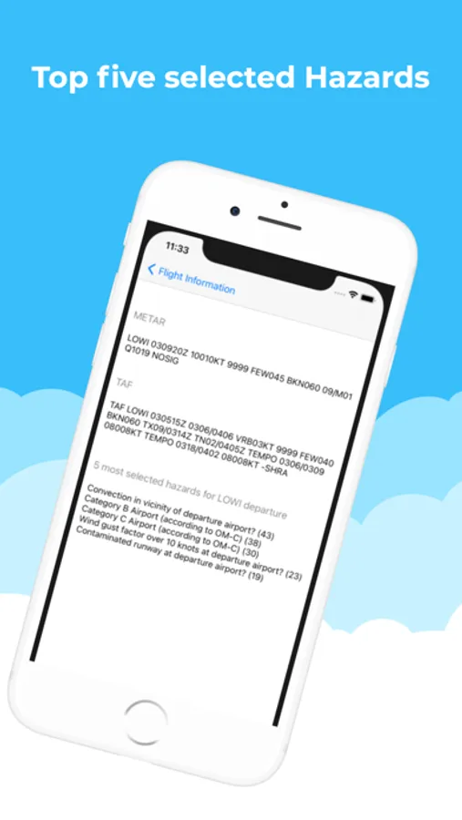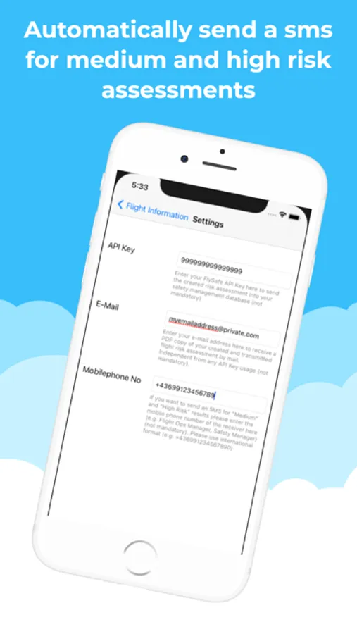 Create a Flight Risk Assessment for a specific flight. Enter Departure, Arrival and Alternate as well as Crew and Aircraft and start checking those hazards you are expecting for a specific flight. Each hazard has a specific value and the sum of those values gives you a quick and easy overview of how complicated your flight might get. After creating the risk assessment send it to a specified email address for documentation. This fully complies with EASA and FAA requirements about risk assessing every single flight and collect the data for further safety improvements. If you want to use your own API or need a tool to get statistical overview out of your flight risk assessments, get in touch with us, we got the full safety management suite for you.