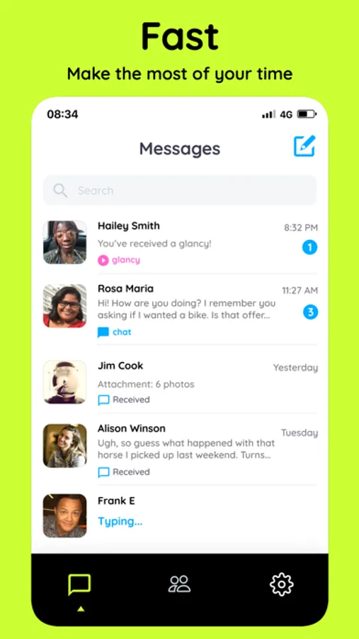 Glancy works with contacts on your phone. If your contact is on Glancy, they will show up as someone you can message. Alternatively, you can (and should!) invite your friends to join Glancy.