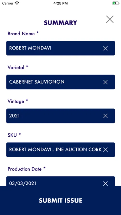- Dropdowns to identify the brand, varietal, size, vintage, and specific quality issue
