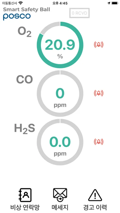 -본사의 Smart Safety Ball와 연동하여 O2, CO, H2S를 보여줍니다. Smart Safety Ball가 없을 시 앱을 사용 할 수 없습니다.