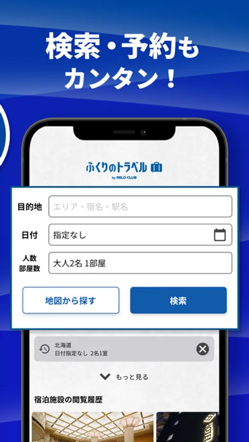 会員専用アプリ「ふくりのトラベル」では全国2万軒以上の宿のお得なプランを簡単に検索、予約することができます。会員ご本人様だけでなくご家族もご利用可能!本アプリで会員優待を思う存分ご活用ください。