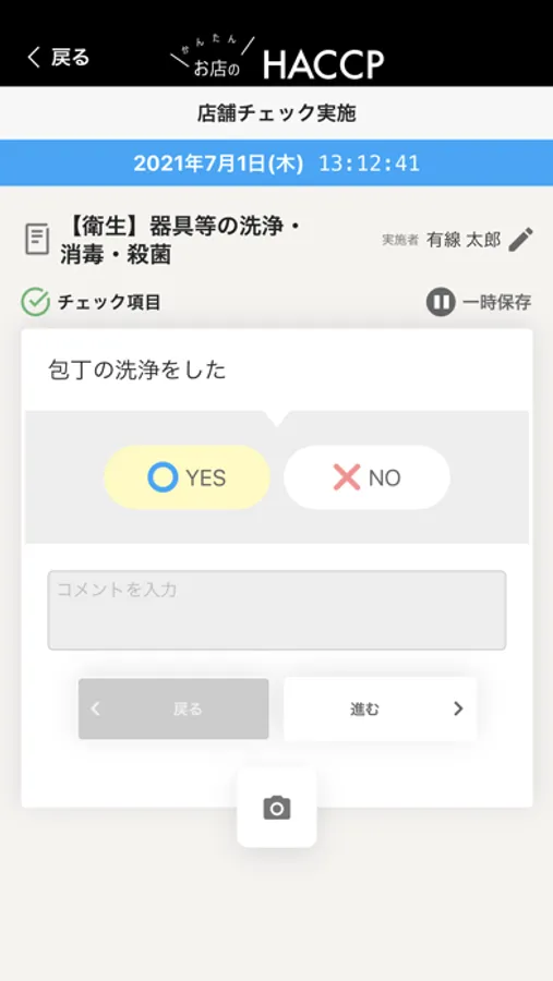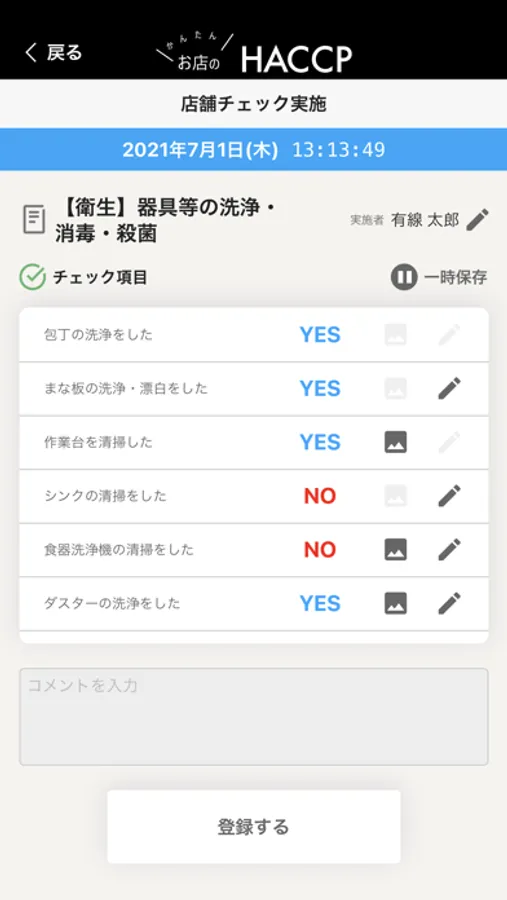 提供する料理カテゴリや店内設備を選択するだけで、店舗に合ったチェックシートが自動生成されます。YES/NOで答えていくだけの簡単チェックで、写真を添付することも可能です。またカスタマイズも可能なので店舗独自のチェック内容を追加することもできます。