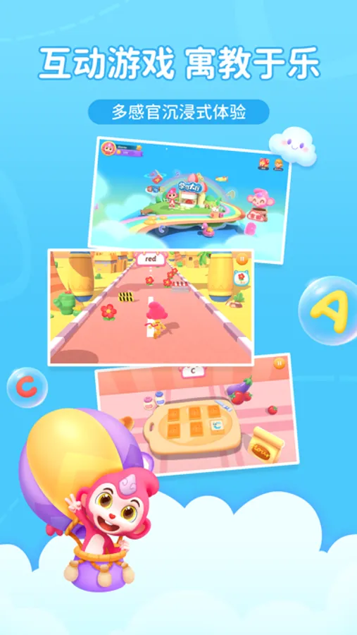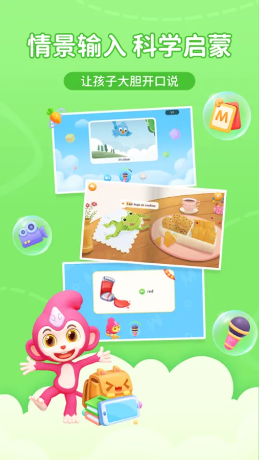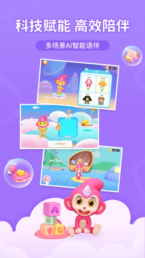 猴小吉ABC,是一个趣味口语启蒙资源平台,根据儿童认知发展规律,基于AI技术,采用互动游戏、趣味动画视频,有声互动绘本,智能场景跟读等形式,让孩子主动说,大胆说,快乐启蒙每一天。