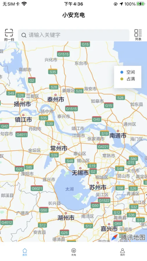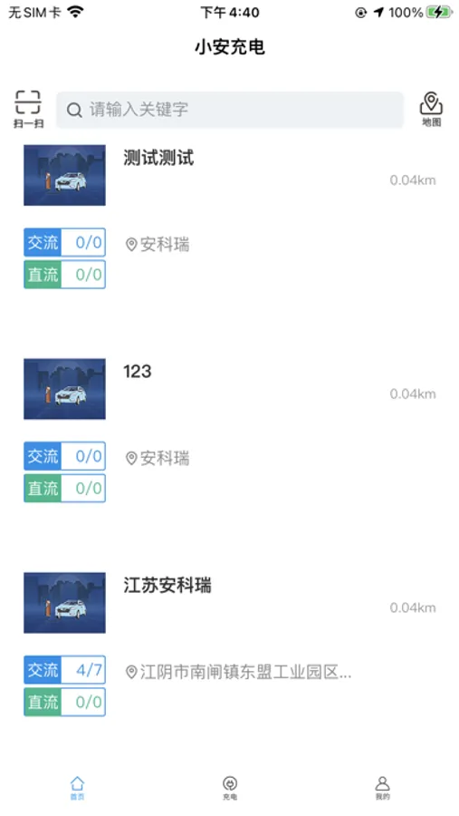 1.首页:进行充电桩的选择,可以根据编号搜索自己想要的充电桩,搜索框旁边有目录按钮,用于切换地图上选择的模式,另外扫一扫功能会切换到充电页面