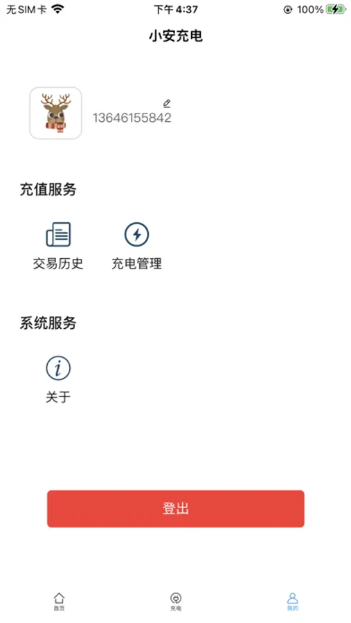 3.我的:在这里可以看到自己的交易历史,也可以进行充电管理,底部有关于按钮,可以对系统服务进行了解。