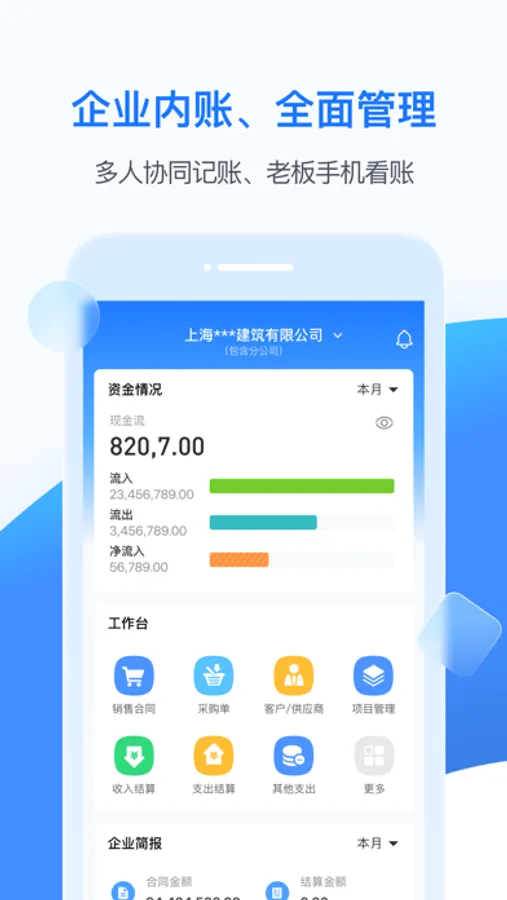 企业合同管理、订单/工程项目管理、利润核算、应收应付、库存管理、多人记账、报销、经营报表,和钱有关的一切统统都管好!