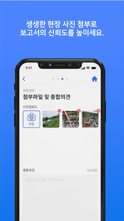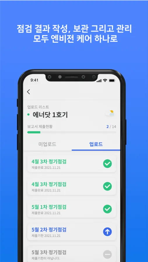 태양광 현장관리 업무를 위한 필수 기능, 앱 하나로 해결하려면? 에너지 비즈니스 솔루션 기업 에너닷이 개발한 엔비전에 관리 발전소를 등록해보세요. 휴대폰 하나로 발전소 유지보수 결과는 편하게 기록하고, 점검 결과 보고서 제출과 현장 사진 첨부, 설비 이력 및 주요 서류관리까지 빠르고 간편해지게 만들었습니다. 엔비전은 실시간 공유되는 주요 일정, 보고서 전자제출-반려 기능, GPS 기반 현장 방문 인증 등으로 태양광 안전관리자와 O&M 담당자의 협업하는 과정을 간소화합니다.