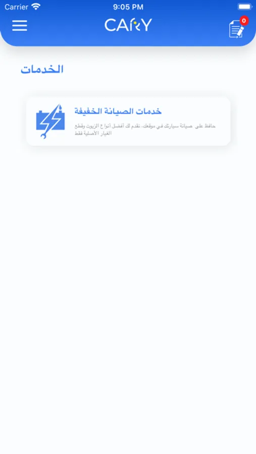 منصة كاري لتقديم خدمات صيانة السيارات الخفيفة مثل غيار الزيت وغسيل السيارات وغيرها من الخدمات القادمة بالمستقبل، حيث نوفر قطع الغيار الأصلية والمواد ذات الجودة العالية فقط باحترافية ومرونة عالية، حيث يتم تقديم الخدمات في موقع الذي يختاره العميل عبر مركبات مجهزة بأعلى المعايير لصمان تقديم أفضل الخدمات.