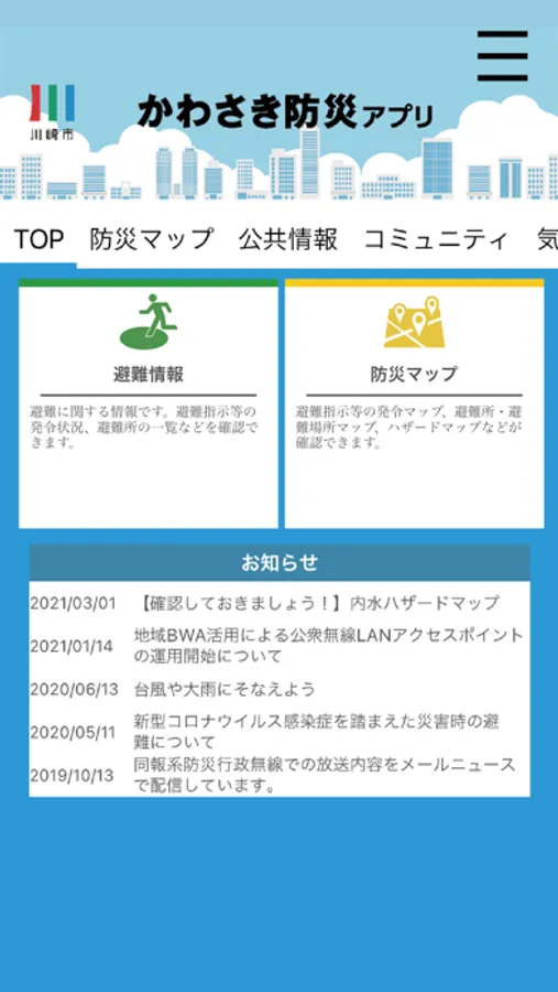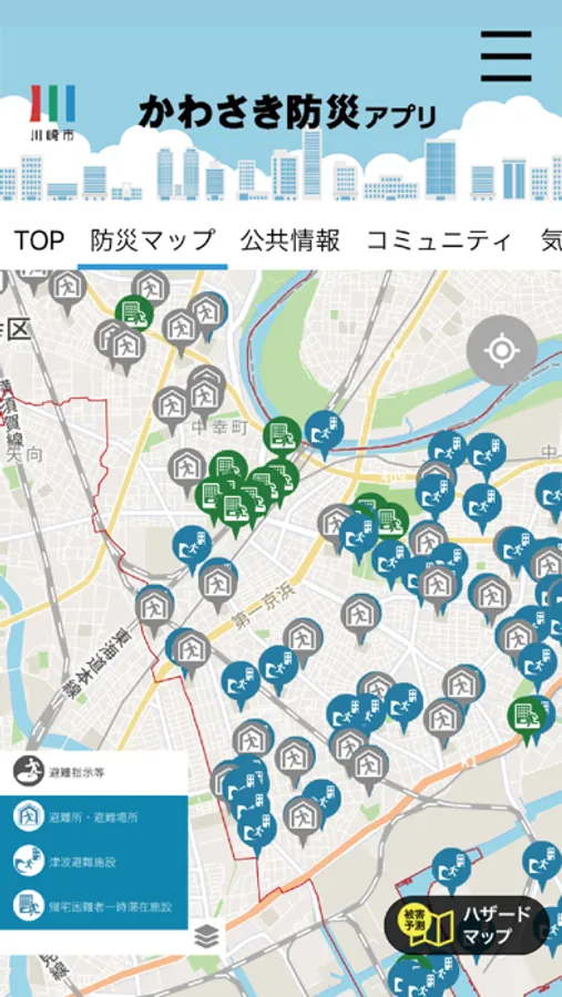 「かわさき防災アプリ」では、地図上に洪水、土砂災害、津波、内水などの危険区域を示したハザードマップを確認できるほか、発令中の避難情報や避難所開設情報、避難所混雑状況を地図やリストでリアルタイムに確認できます。